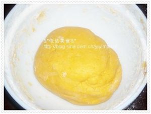 南瓜趁热压烂,加入糯米粉搅拌均匀,再加入面粉搅拌: