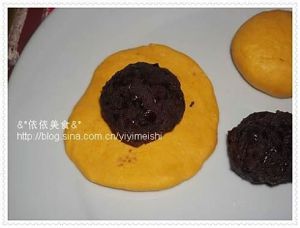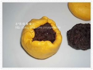 把面团用手掌压扁,慢慢用手压成中间厚,四周薄,放进豆沙馅: