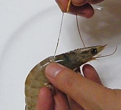 将虾仁从背部抛开,去虾线,用花椒粉,盐,柠檬汁加以研制