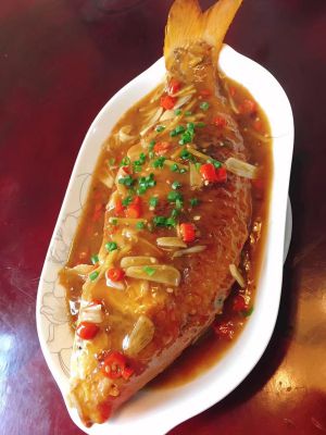 鱼闷了几分钟之后翻面,加一点生抽 一点老抽,盐,然后差不多收汁,把准备好的淀粉什么的倒进去勾芡,水开即可出锅