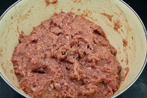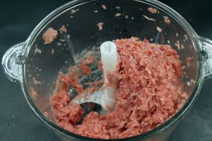 将猪肉放绞肉机里面搅成泥状(要很细腻的这种),不然做出来的不光滑,不紧实。