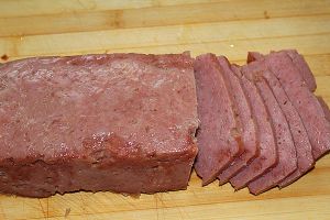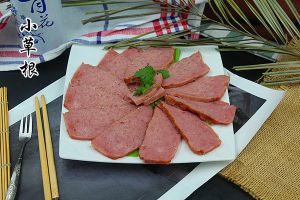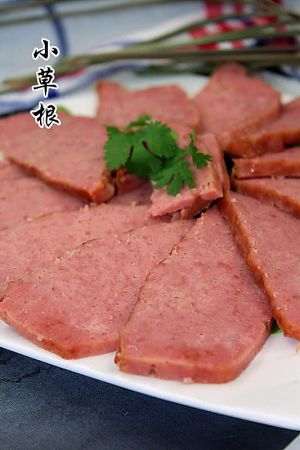 网上买现成的午餐肉料包(味道和罐头味道一样,这一包能做2斤到2斤半的肉,如果自己拌馅味道没有罐头味道,自己拌馅加适量的盐,淀粉95克,红曲粉5克,五香粉鸡精适量,白糖葱姜适量,加清水150克拌匀肉馅也可以)