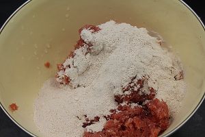 加清水150克,用手使劲搅拌匀肉馅,摔几下上劲。