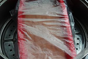 将肉馅倒进去,铺平,大约6到7厘米的厚度,表面盖保鲜膜,冷水进蒸锅,蒸锅上汽后,30分钟成熟。