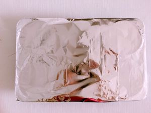 用锡纸包裹住模具,压紧四周,放入烤箱预热好的烤箱,170度35分钟,如果有比模具更大的烤盘压紧模具效果会更好,避免面包顶部烤得不平整。