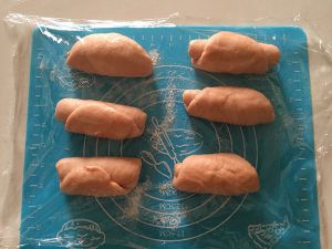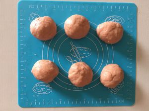 .将发酵好的面团称重,均分六份,排气后滚团盖上保鲜膜松弛15分钟左右。