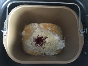 面包桶内依次加入水、鸡蛋,倒入面粉、奶粉、红曲粉,尽量让面粉覆盖整个水面,靠近面包桶一角放盐、另一角放糖。在面粉上挖个坑,把酵母放入小坑内,确保酵母不与水和盐接触,