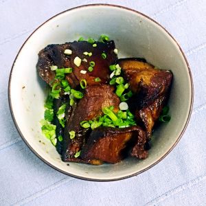 然后放生抽、老抽、再放绍兴黄酒、此款菜不用盐不用水、只需要生抽调味、黄酒去腥、生姜冰糖提鲜即可。最后再码上剩余的小葱。记得留两根摆盘用。