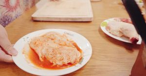 鸡腿肉去骨,用调制好的汁儿涂抹鸡腿肉表面,稍加按摩腌制20分钟。