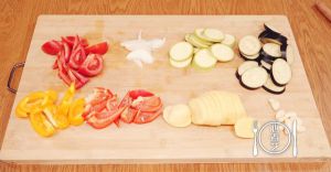 土豆、大蒜去皮和西葫芦、茄子全部切大片,彩椒去蒂切成条,洋葱,西红柿切成小块,将腌制好的鸡腿肉切成麻将大小的块儿。