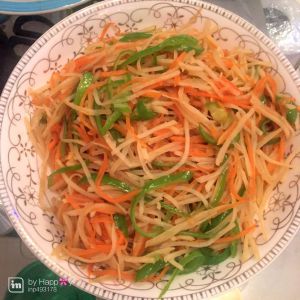 放适量的油、加入葱花爆香、炒出香味后加入沥干水的土豆胡萝卜丝、煸炒两分钟