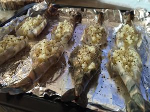 蒜蓉先用油爆过,这样能增加蒜的香味,同时也缩短烤的时间,锡纸铺盘,撒上少许黑胡椒,烤箱上下模式,180度先预热3-5分钟,排好的虾子放入烤箱,看见虾壳变红后,再烤2分钟左右就可以出炉啦~~