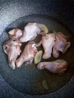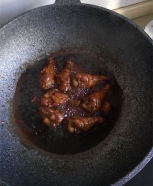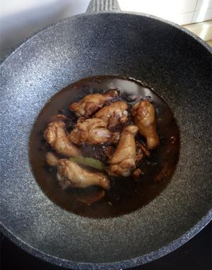 加入黄酒、白糖、全部香料、母子酱油煮1分钟左右色鸡翅上色
