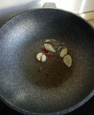 热锅放入食用油,马上放入生姜、蒜肉、再放红辣椒,辣椒不要炒糊了