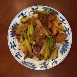 最后放葱白 和 洋葱(洋葱要提前拨成片)炒至葱 和洋葱的味道出来 就可关火成盘