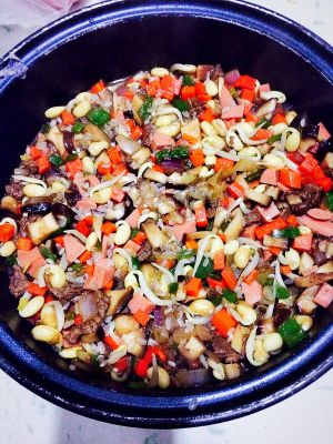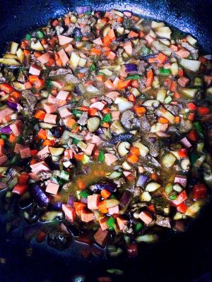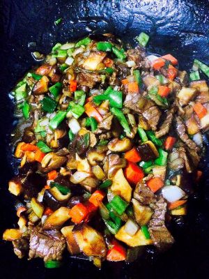 炒至8分熟,加入水,水的量不要末过翻炒的食材即可,
