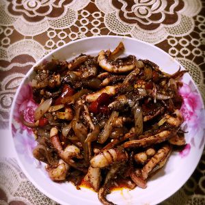 将炒好的洋葱捞起装盘 放入油 鱿鱼翻炒几分钟后加入洋葱再次翻炒