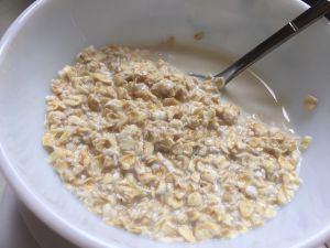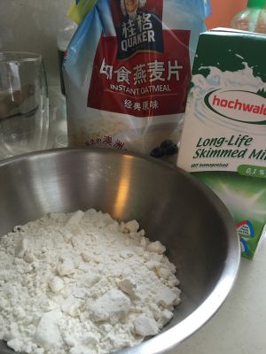 准备好普通中筋面粉、燕麦片和牛奶(我用的是脱脂牛奶,你也可以用家里常喝的牛奶和水也可以的)