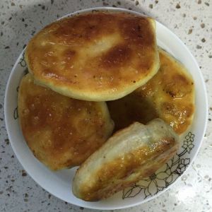 平底锅准备好,热锅冷油,将饼放入锅中,倒入水,能淹到饼底即可,不要太多,然后盖上锅盖,慢慢煎吧。中途水快干的时候翻个身,把握好火候,千万别糊掉。