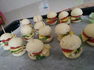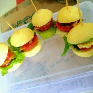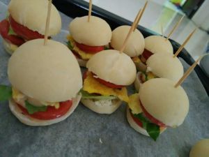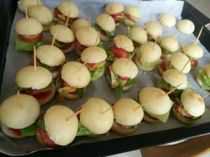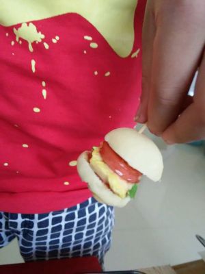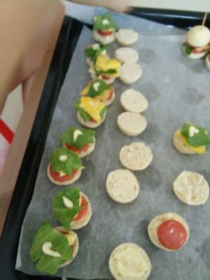 热狗切片炒熟,鸡蛋煎块切开小份,生菜洗干净,放番茄酱一层,鸡蛋块,番茄片,生菜,沙拉酱等自由组合