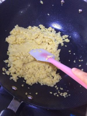 倒入玉米油翻炒绿豆泥,等差不多全部绿豆全部吸收玉米油后把砂糖和麦芽糖倒入锅中翻炒