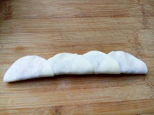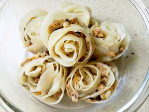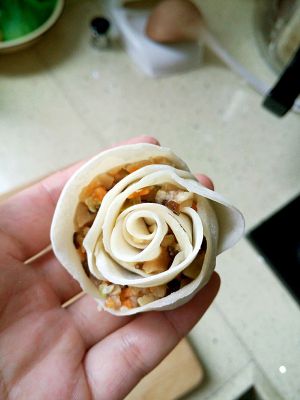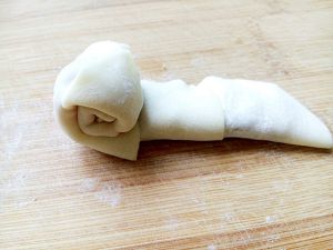 对折好的饺子,从左到右卷起来,最后一片尾部,可以沾点水,黏住,防止脱开