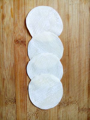 取四片饺子皮,挨着放。亲们可以在砧板撒些面粉,防止黏连