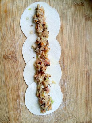 在饺子皮中间位置依次放入饺子馅,注意,太多会卷不起来,适量就好。