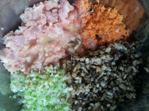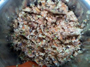 将三分肥,7分瘦的猪肉洗净剁成肉泥,包菜和胡萝卜洗净晾干水分切成颗粒,干香菇泡水,挤干水分,切成颗粒备用