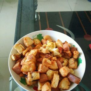 最后把面包鸡蛋放入,感觉面包炒热了即可,如果喜欢的话可以再淋些番茄酱。