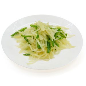 打开火,待油温6成热时,倒入青椒丝、土豆丝煸至熟出锅即可。