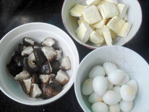 鹌鹑蛋煮熟去壳;香菇切块焯水;豆腐切块焯水