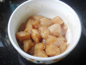 鸡肉切小块,加入酱油、料酒、淀粉和适量盐油拌匀腌制一会儿