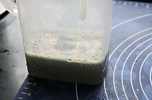 把打好的薄荷汁通过过滤网倒入容器中,滤掉沫子和渣子。