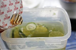 在容器中加入1.5升纯净水并放入薄荷,倒入蜂蜜搅拌均匀就可以饮用了。