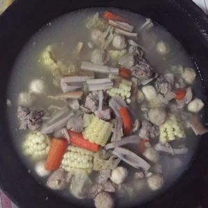 锅里加入汆排骨的水放入排骨,藕,胡萝卜,肉丸,玉米,盐,料酒,八角,小茴,炖40分钟就好了,,最后放一点醋,有利于钙的吸收,