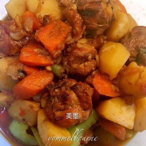 把胡萝卜块土豆块放到鸡肉上,加上热水适量,如需要汤汁多一些,多加水,焖煮至胡萝卜土豆绵软,不是烂糊啊
