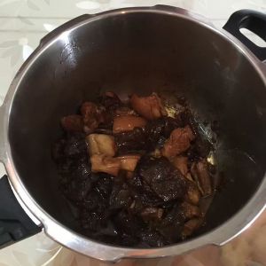 这样就已经熟了,红烧肉在下面,可以翻动了,软软胖胖的,口感非常好喔!有嚼劲~