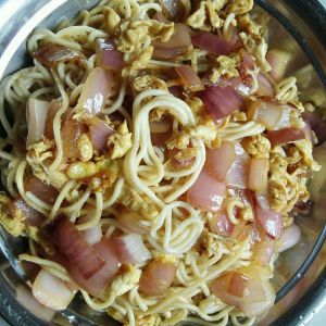 鸡蛋炒至微焦黄,加入切好的洋葱。继续翻炒,至洋葱断生。