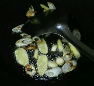 热锅热油,葱姜蒜下锅爆出香味捞出。