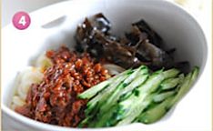 把肉酱挤到面条上,黄瓜切丝码好,木耳切丝码好。