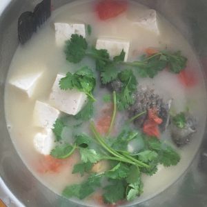 十分钟后汤已经变成奶白色了加入豆腐再煮三分钟。