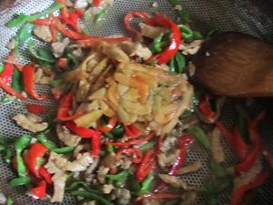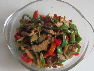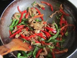 待肉丝煸炒变色后, 加入青红椒丝煸炒;