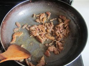 将锅加热, 放入少量油, 下入腌好的肉丝煸炒;