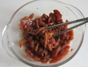 将盐,生粉, 生抽放入肉丝中, 腌制十分钟;