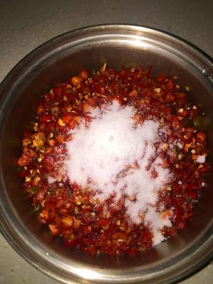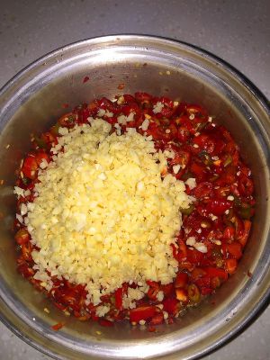 把切好的蒜茸加入到杀过水的椒碎里,拌均匀。