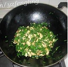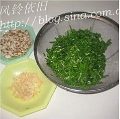 韭菜切碎,豆干切丁,鸡蛋打散并加点料酒、盐,虾皮略泡
