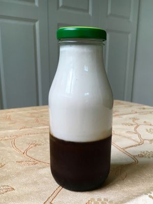 冷却后倒入玻璃瓶三分之一处,放入冰箱冷冻。咖啡放置这个位置,玻璃杯是不会炸的。