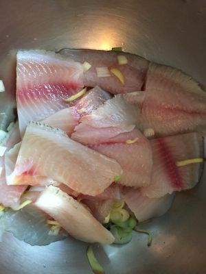 鲷鱼洗干净控干水改刀,用花椒葱姜盐花雕酒抓匀,腌制2小时。
