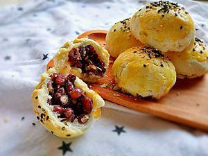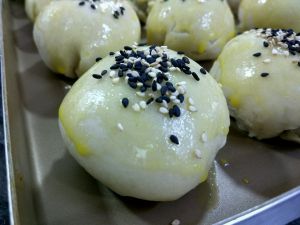 烤箱180℃,预热10分钟。酥包表面刷蛋黄液,洒芝麻,后入烤箱30-35分钟。